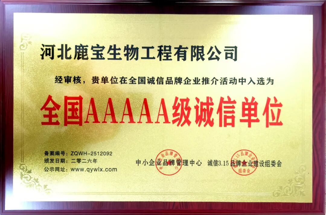 熱烈慶祝河北鹿寶生物工程有限公司,獲評2026年度全國AAAAA級誠信單位(備案單位:中小企業品牌管理中心,2026品牌宣傳備案編號:ZQWH-2512092)